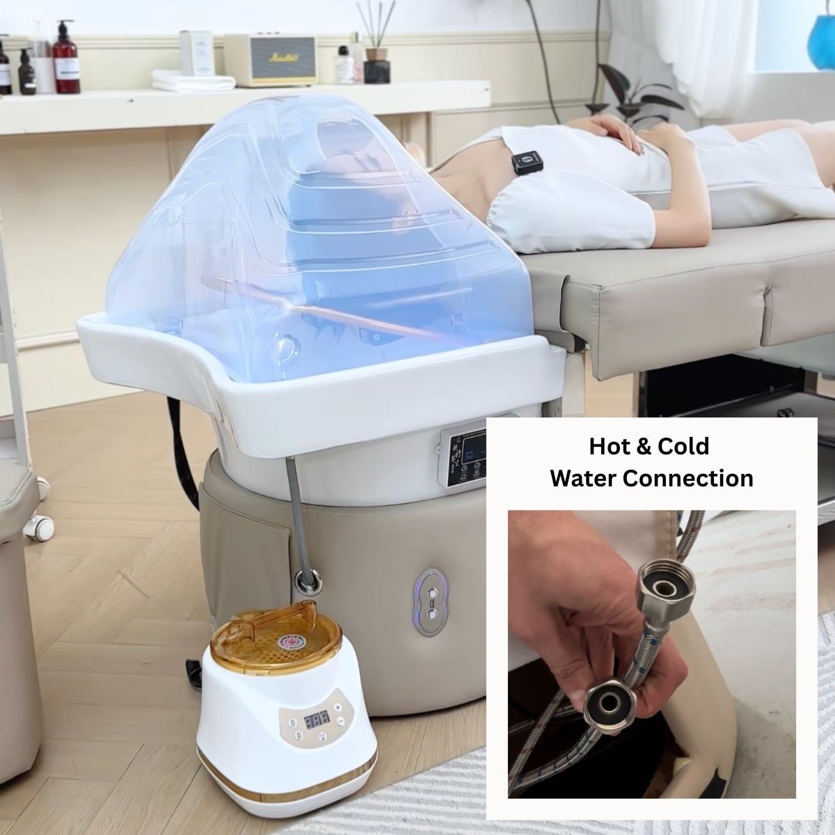 To prioritize hygiene, the headspa comes with a direct water connection: 1.cold water 2.hot water and 3.drain